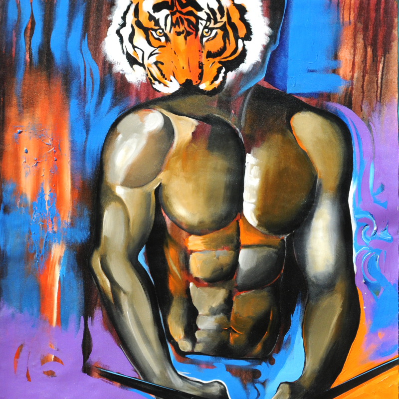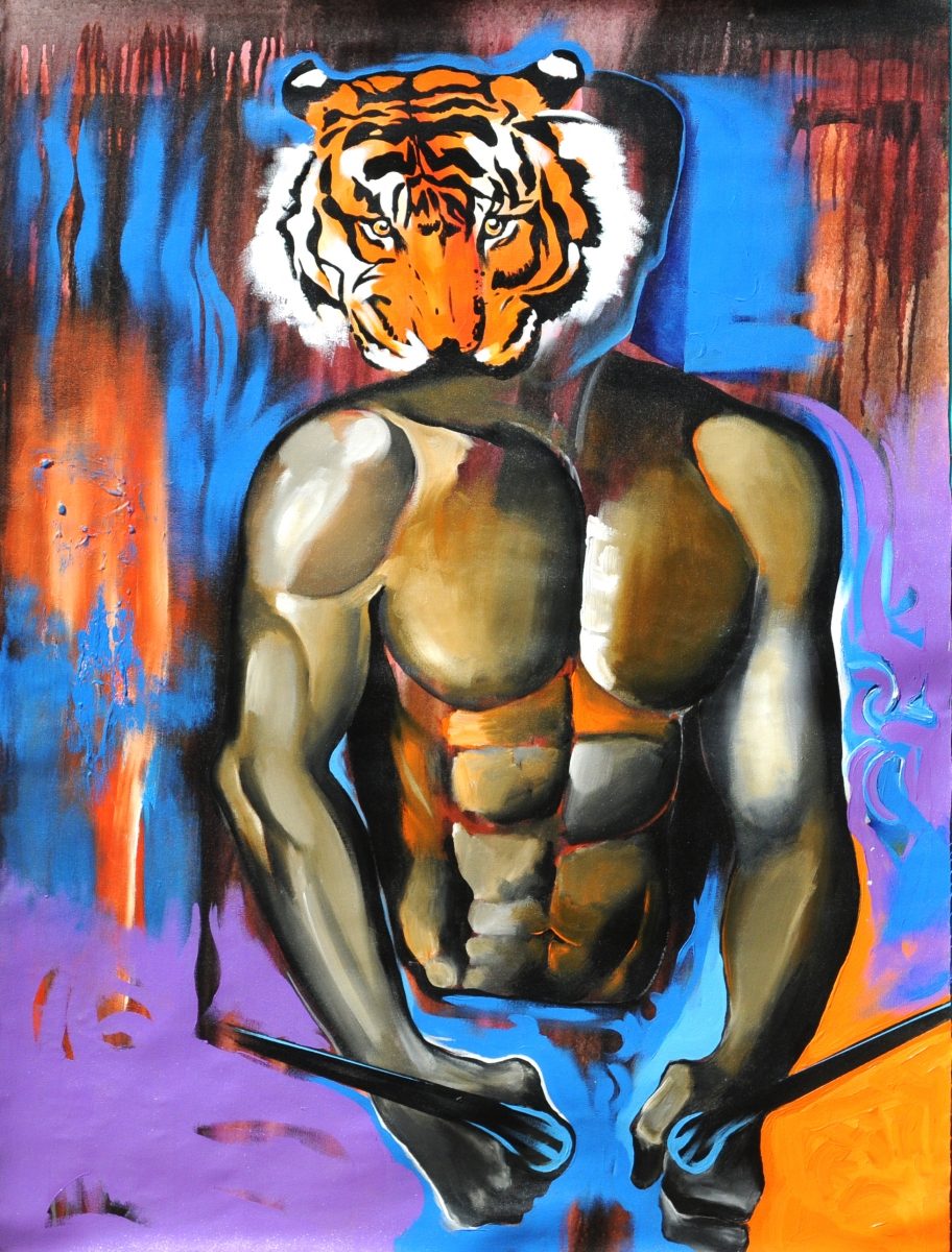 Natesh's paintings from 2007 onwards announce his angst loudly, and they purposefully look unfinished and crude. His angst has its origin in the ecological feminism he has adopted and the disgust he harbours for the expressions of popular culture. He records in his notebooks, ‘So soap-ops are not a mistake, we deserve them. Let me repeat...Yes, the violence, enmity, hatred, disgraceful behaviour in middle-class households are portrayed truthfully. Soap-ops are God-sent bounties for commercials. Everyone, I suppose would shut off the volume when they arrive, like mosquitoes in the evenings when we shut the windows to avoid large numbers. This alone is enough, to swear, for the intelligence of our populace since they are not letting them plant demands at will’. In a series paintings named after a commercial Hindi film ‘Gajini’, Natesh ridicules the muscular male body revered in the film. In ‘Gajini 1’ (Fig. 15) the face of a six-pack muscles of a male torso has the face of a tiger, and it looks artificial like a film poster and offends the viewer with its garish colours.
