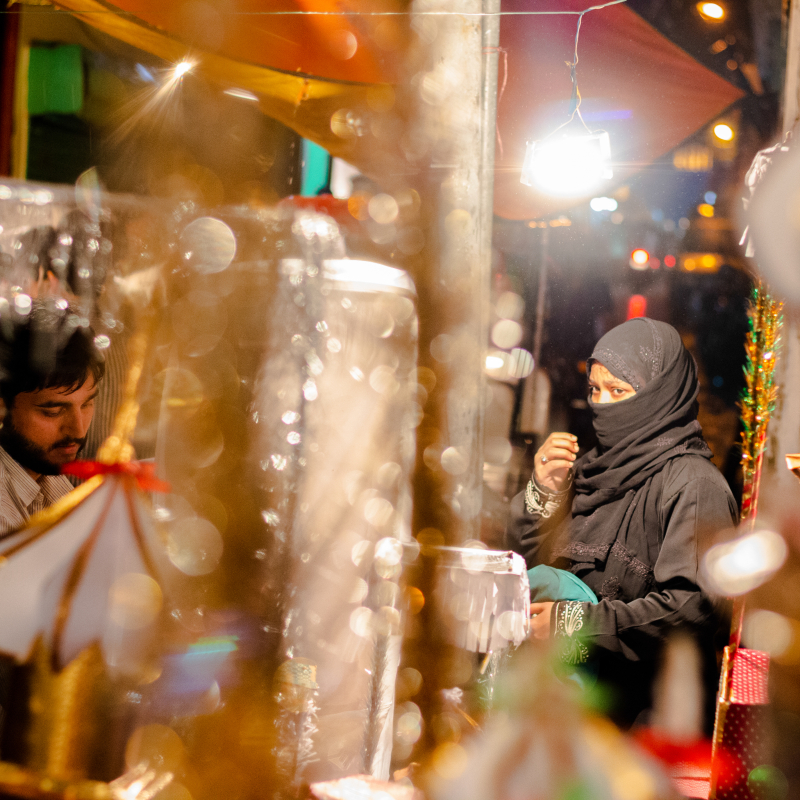Rauz-e-Kazmain is one of the major taziya making centres in Lucknow where almost all residing families are into bamboo taziya making. Men and women of the locality are equally involved in this extensive labour and creative work. Many taziya makers borrow money to arrange raw materials required in bulk and rent space in Rauz-e-Kazmain’s compound to store their taziye until sale. Some of the makers also use tarpaulin sheets to keep their creations safe from weather extremities. (Fig. 1) A well-lit taziya market is set up at Kazmain prior to the start of Muharram month. People from all walks of life frequent the market and make a purchase according to their budgets as well as azakhana (a private, temporary imambada) size