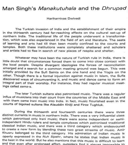 The article gives a brief introduction to the patrons of Indian classical music during 13th century, focusing on Raja Man Singh Tomar (1486—1516) and his work Manakutuhala.