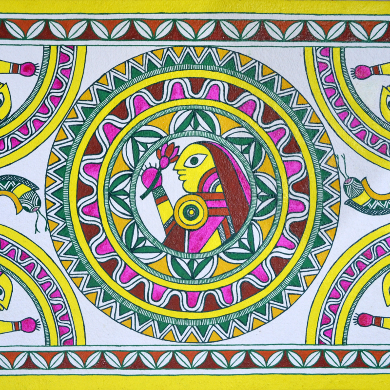 Borders are very important in Manjusha paintings (Fig. 4); motifs such as leheriya, sarp ladi, tribhuj, mokha and belpatra are generally used for making borders. Sometimes, artists also use a solid band of yellow, green or pink colour after these motifs to enclose the painting and make it look complete. (Fig. 5)
