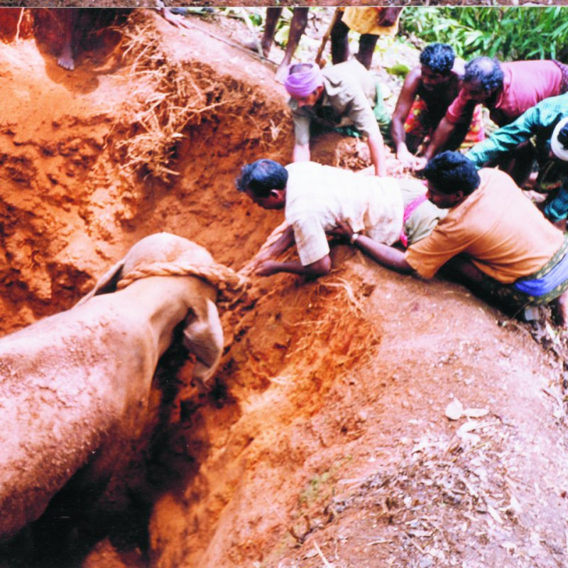 Prevalent in South India, this was an inexpensive but primitive method of capturing wild elephants. One of the most detailed descriptions of the process of pit making and capturing is provided by T.F. Bourdillon in the Report on the Forests of Travancore. He describes pits—four to five metres deep, four metres square at the top and three metres square at the bottom, so that the walls had a slight incline—dug along elephant paths. The pit was filled up to two metres deep with brushwood, twigs and bundles of grass to cushion the elephant’s fall. The pit opening was made to look as natural as possible by camouflaging it with a lattice of split bamboo sticks, which were covered with grass and leaves. The excavated earth would be moved some distance away. The pit was inspected daily, but even if it was not, he writes that the trumpeting of the elephant when it fell in would be loud enough to be heard as far as a kilometre away.