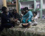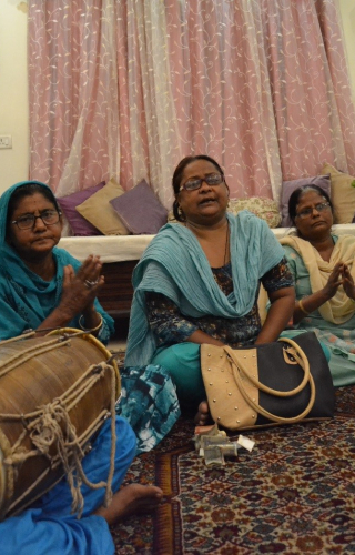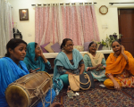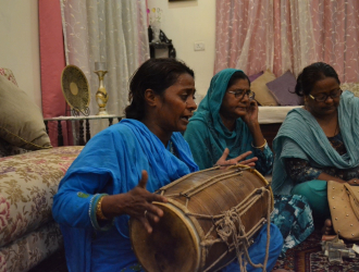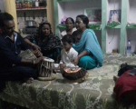 This photo documentation tries to capture the acts and performances of Mirasins. In the first three photographs they can be seen performing in the house of one of the taluqdars. Though a big enough diwan was placed in the room, they sat down on the carpet to sing. It is customary for mirasins to sit at a lower level than their patrons. In the fourth and the fifth photograph the mirasins can be seen singing in their home. The child is clapping along the beats and will gradually learn the art without any ‘formal’ training. A qawwal, brother of one of the mirasins, is on the tabla.