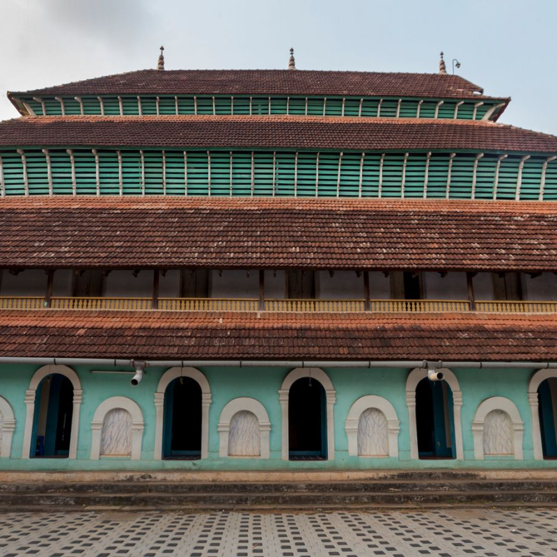 The Muccunti Mosque[4] is another important mosque in Kuttichira, constructed on land donated by the Zamorin of Kozhikode as a token of his love, respect and gratitude to the Muslim community of the region. A slab of black granite carries an inscription—written in the Vattezhuthu script (old Malayalam) on the left half and Arabic (seems to be in the Kufic style of script) on the right half—which mentions the Zamorin’s donation and regular payments towards the expenses of the mosque. It is one of the earliest mosques built in Kerala. Its small rectangular original structure, which to a large extent has been maintained, has an open colonnaded porch with three doors opening to a small antechamber. Three doors from the antechamber lead to the prayer hall. Like the Mishkal Mosque, there are a number of doors with semi-circular arches and wide borders in the exterior around the mosque leading to the antechamber or prayer hall. Notable architectural features of the mosque include its colonnaded porch, decorated beams with religious inscriptions, and the coffered ceiling. The mihrab is semi-circular and has a semi-circular arch with a wide border and there is no minbar. The roof structure has two parts: the space above the original mosque has a single hipped roof[5] supported by wooden columns. The roof of the porch is designed in two distinct external tiers and is given a three-tiered appearance by indenting the eastern gable end.