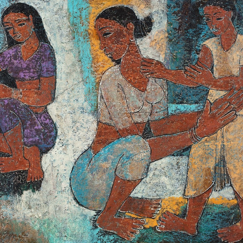 P.T. Reddy was born in Andhra Pradesh and studied painting at the J.J. School of Arts, Bombay. He spent his younger days working in the family business and returned to art in the 1950s. He evolved a unique vision of his own, creating a variety of complex portraits. Unlike Dhurandhar, who gave us an insight into the relationships between his family members, Reddy was an observer of the world around him. 'Mother and Children’ was painted in 1958, showcasing the artist’s sensitivity and skill in rendering realistic portrayals of life around him. In this painting, he depicts a mother and her two children, with their colourful clothes, in an almost playful style. The mother is seen reaching for the boy while looking back at her daughter.