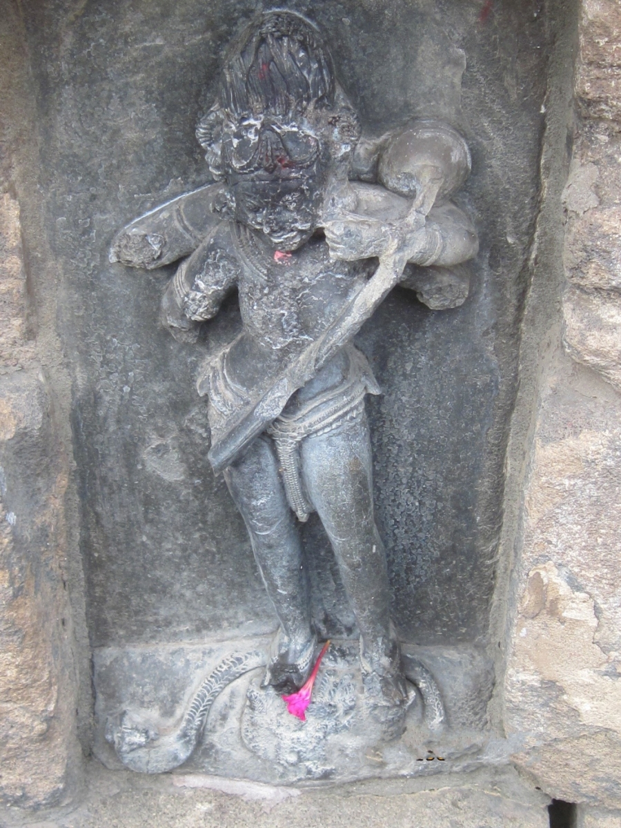 All the Yoginis depicted here are in standing position and are much less elaborate than the Yoginis belonging to later period, the ones found in Chausath Yogini temples of Madhya Pradesh and Uttar Pradesh. Barring one, each of these Yoginis have a variety of mounts, especially animals. Unlike the sombre and meditative Yoginis of Bhedaghat or Rikhiyan, Hirapur Yoginis range from deities in celebratory to warfare mode. Some of these Yoginis have Kapalika or crematoria iconography where they are depicted standing on a corpse or carrying and even drinking from a skull cup. These very expressive Yoginis are seen merrymaking while drinking from a wine vessel, playfully touching their toes. The ones which are in war mode are Agneyi, Chamunda, Bhalluka, Aghora and Vindyavalini. The theomorphic figures include Narsimhi, Ostagriva, Varahi, Sarpassa, Ganesi, Bhalluka and Vikatanaina.