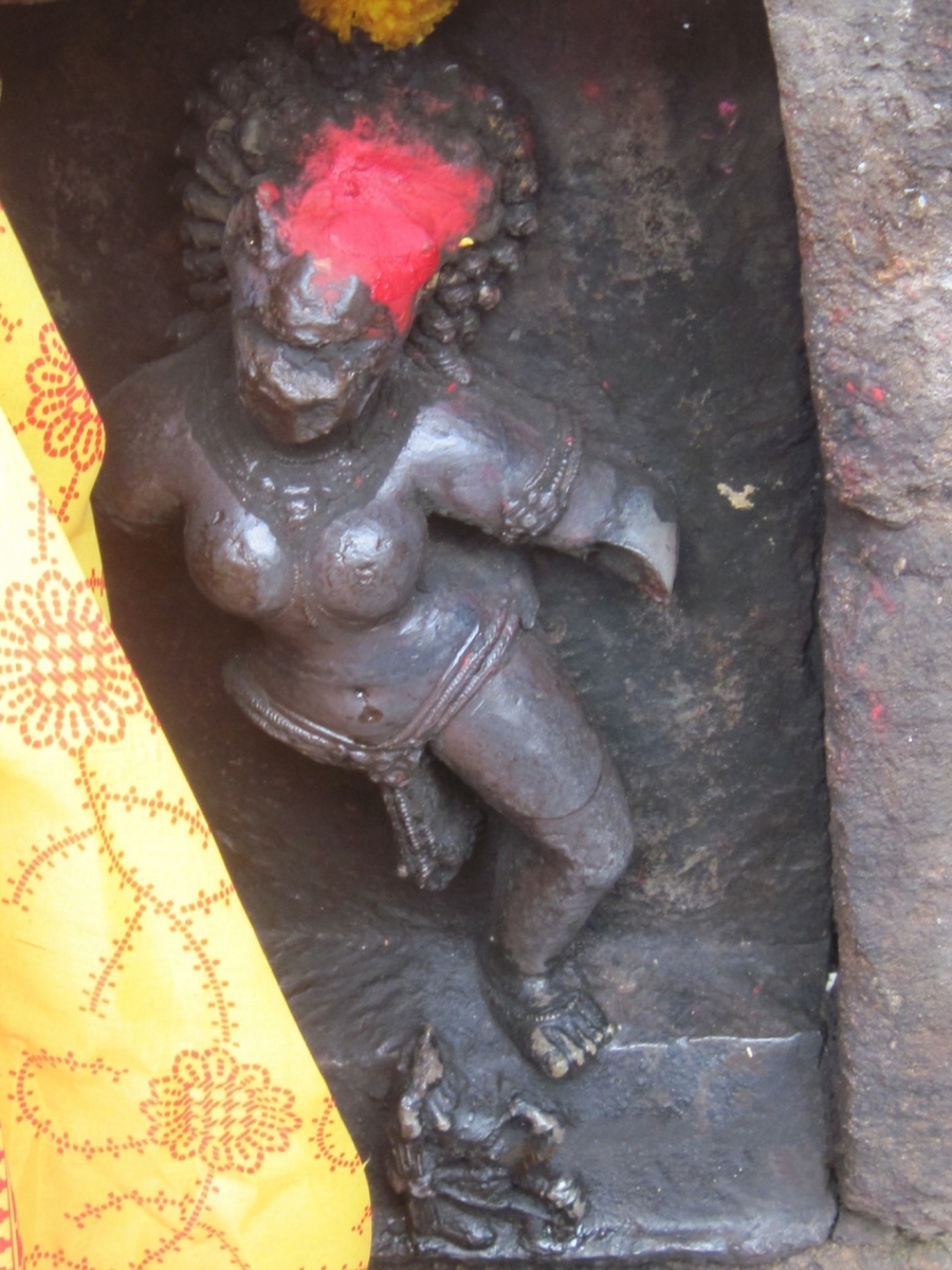 The Katyayanis unlike the Yoginis are carved in sandstone. Out of the nine Katyayanis, seven are shown flanked by an attendant holding an umbrella. These Katyayanis are gaunt warrior figures each holding a weapon. All the Katyayanis are standing on a human head (each looking different from the other) and are flanked by a dog.