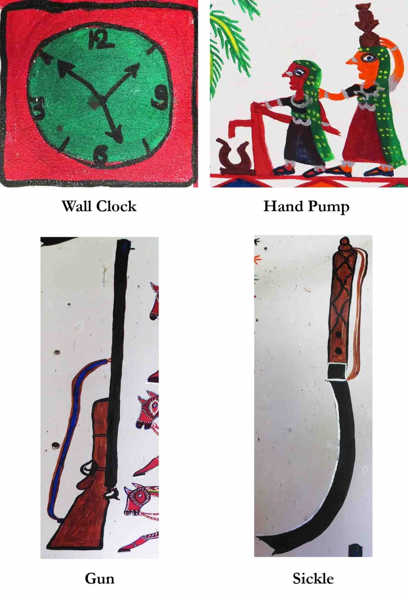 Pithora painting also depicts instruments of daily life.