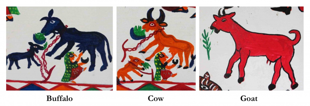 The Rathvas consider the buffalo and cow holy animals. Their produce—milk, buttermilk, dung, curd etc.—are extremely important in the lives of the Rathva. Cowdung is also utilized in several ceremonies of the Baba Pithora ritual. The Rathva’s believe that the goat was the first animal to be domesticated by their ancestors. The working class of the Adivasi community often rear goats to meet their milking needs. The goat is an important part of the Baba Pithora ritual, since it is a common choice for animal sacrifice.