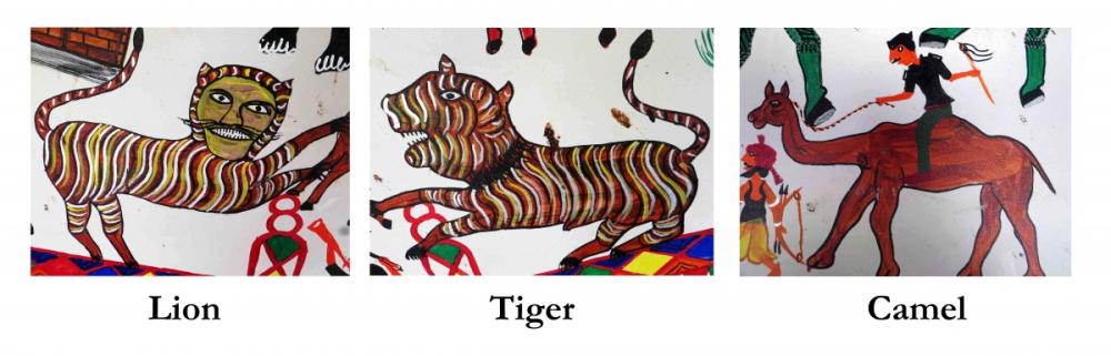 Lion is the symbol of strength and religion; he is also the most powerful animal and a vehicle of several gods. Tiger is portrayed as the protector in the painting. Lion and tiger are portrayed atop the celestial gate, as they protect the inhabitants. The Rathva, Nayak and Tadvi communities celebrate a ritual to entice the rain, when people in the costume of camels go out in procession. This ritual is called untadi kadvi ('bring out the camel').