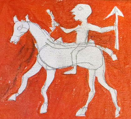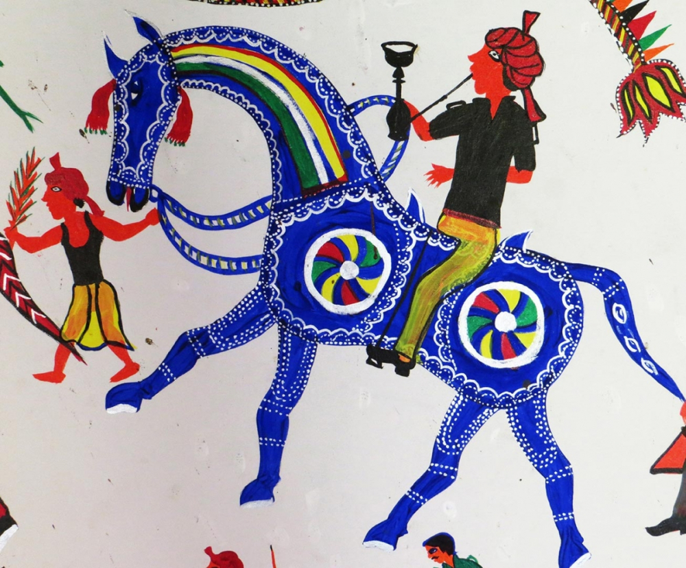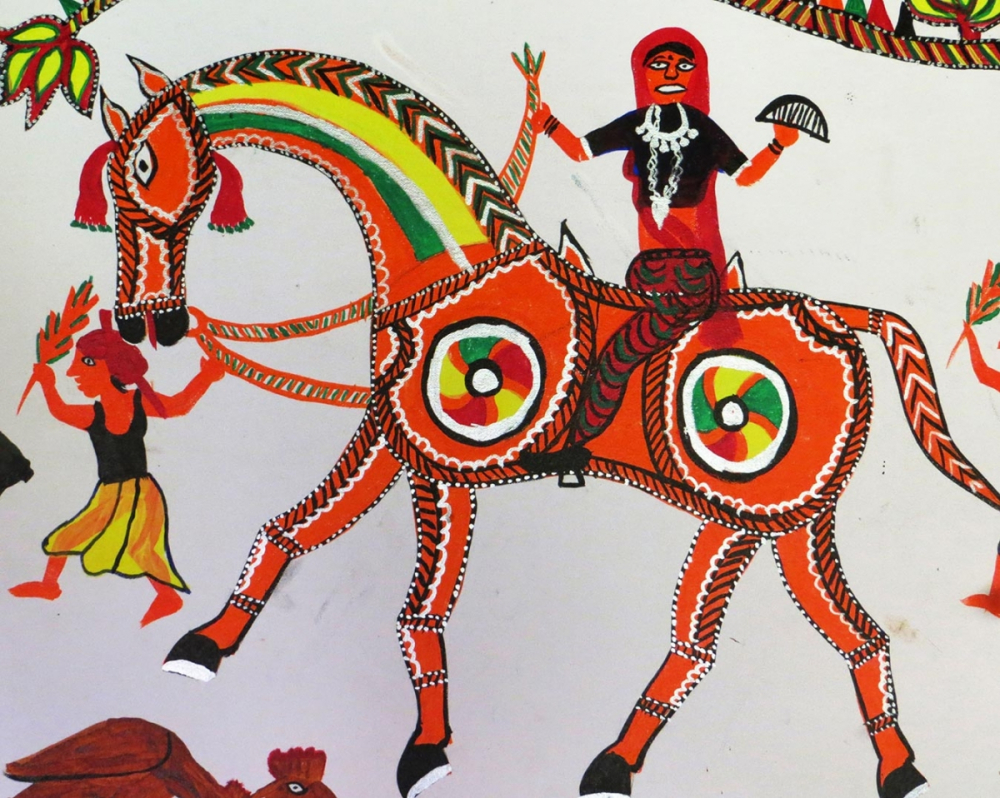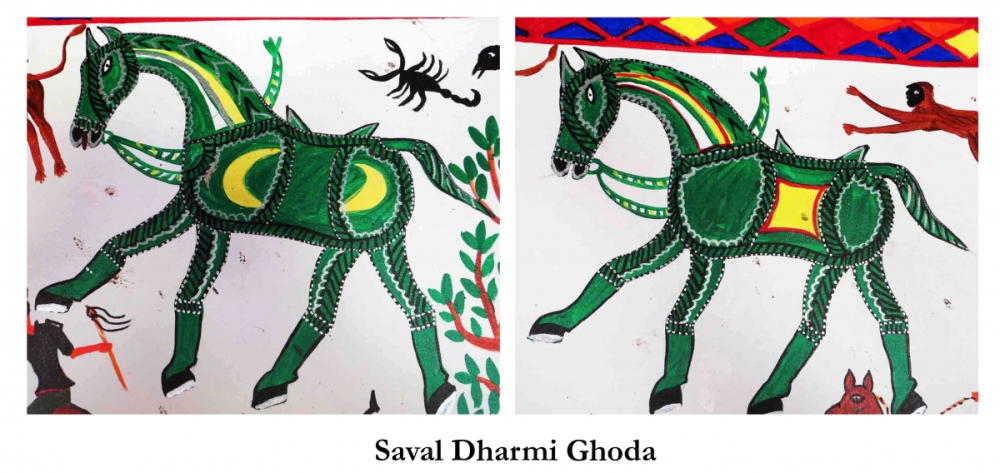 The Saval Dharmi Ghoda (horses of civic righteousness) are an important element of the Pithora painting. In the cultural tradition of the Adivasi, there are several mentions of the great exploits of heroes, and Saval Dharmi Ghoda represents these heroes in the Pithora paintings.