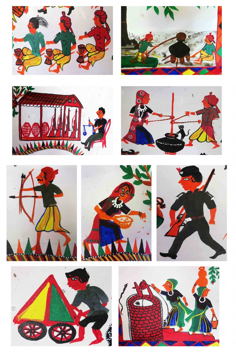 Motifs related to human activities: Pithora painting shows several human characters and scenes of daily activities: the Bhuva conducting ceremonies, the village tradesman, the hunter, policeman, village postman, alcohol making, buttermilk churning, women drawing water from wells or hand pumps, men and women dancing.