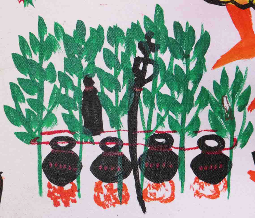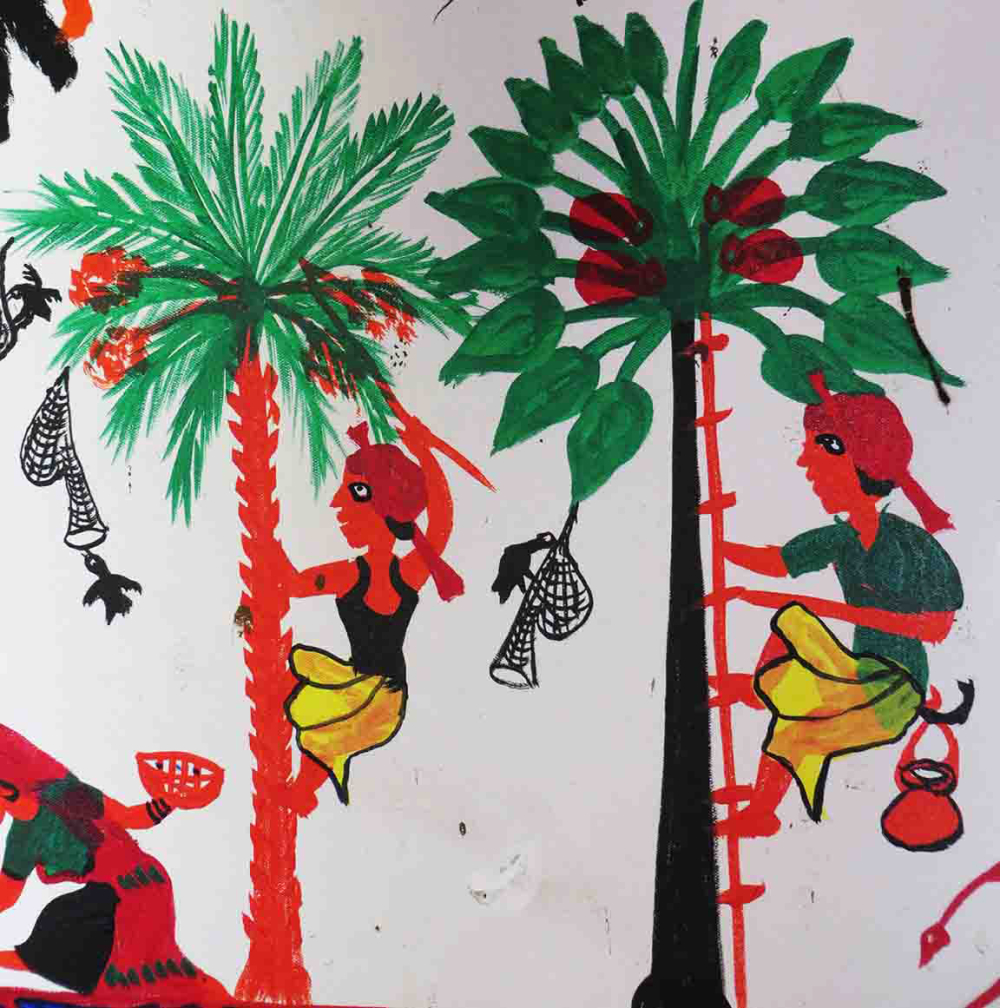 The branches of kadam tree are important in the ritual of the Pithora painting. The family of Ghardhani takes out a procession to the nearest kadam tree to gather its branches; the dhol and pehi are played in the background. The Tad and Khajoori trees can be seen extensively in Adivasi areas. The tad tree yields a sweet fruit called tadkali which is used to make nira, which is a very healthy and medicinal drink and is the main ingredient for making the alcohol drink called tadi. The leaves of the tad tree were used for making roofs and walls of Rathva homes and used as a medium to write on. Similarly, the khajoori tree has many uses apart from its fruit khajoor (dates).