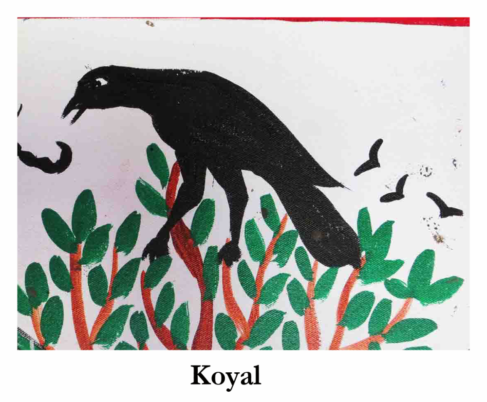 The Koyal bird features in the Pithora painting as symbolic representation of Rani Kali Koyal, the birth mother of Baba Pithora and the most beautiful sister of Baba Ind.