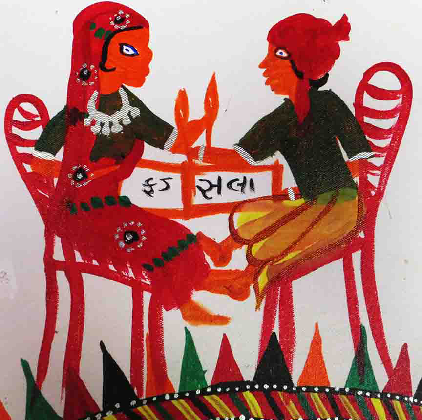 Rani Kajal is the sister of Baba Ind and foster mother of Baba Pithora. She rescued Pithora as a child from the sea and looked after him. In the Pithora painting, she is painted on the left side and has a very important status as a mother.