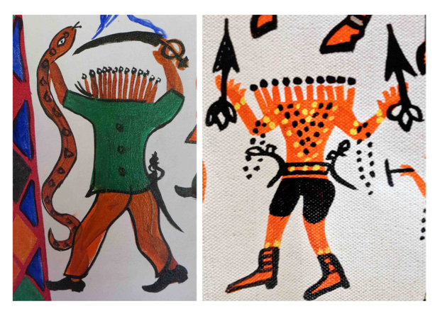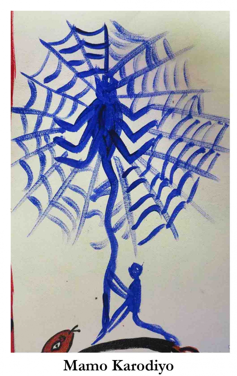Mamo Karodiyo is considered the maternal uncle of Baba Pithora. Once upon a time, when Baba Pithora was on a quest to meet Baba Ind and needed to climb to heaven, he sought the aid of Mama Karodiyo who helped him climb up to heaven on his web. This is how Mamo Karodiyo found his way into Pithora painting.