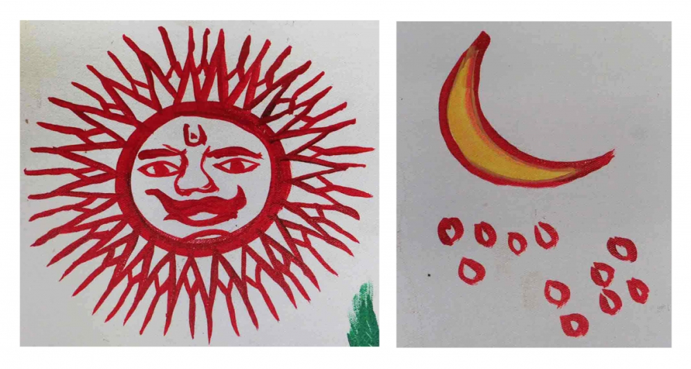 Motifs of Nature: The sky, gods, earth, human beings, vegetation, animals, birds and all living creatures of the universe are comprehensively incorporated in the Pithora painting of the Rathva community. They exhibit a prudent understanding of the universe through the medium of their painting. The recurring motifs related to elements of nature are the sun, moon, and trees that are considered holy by the Rathva.