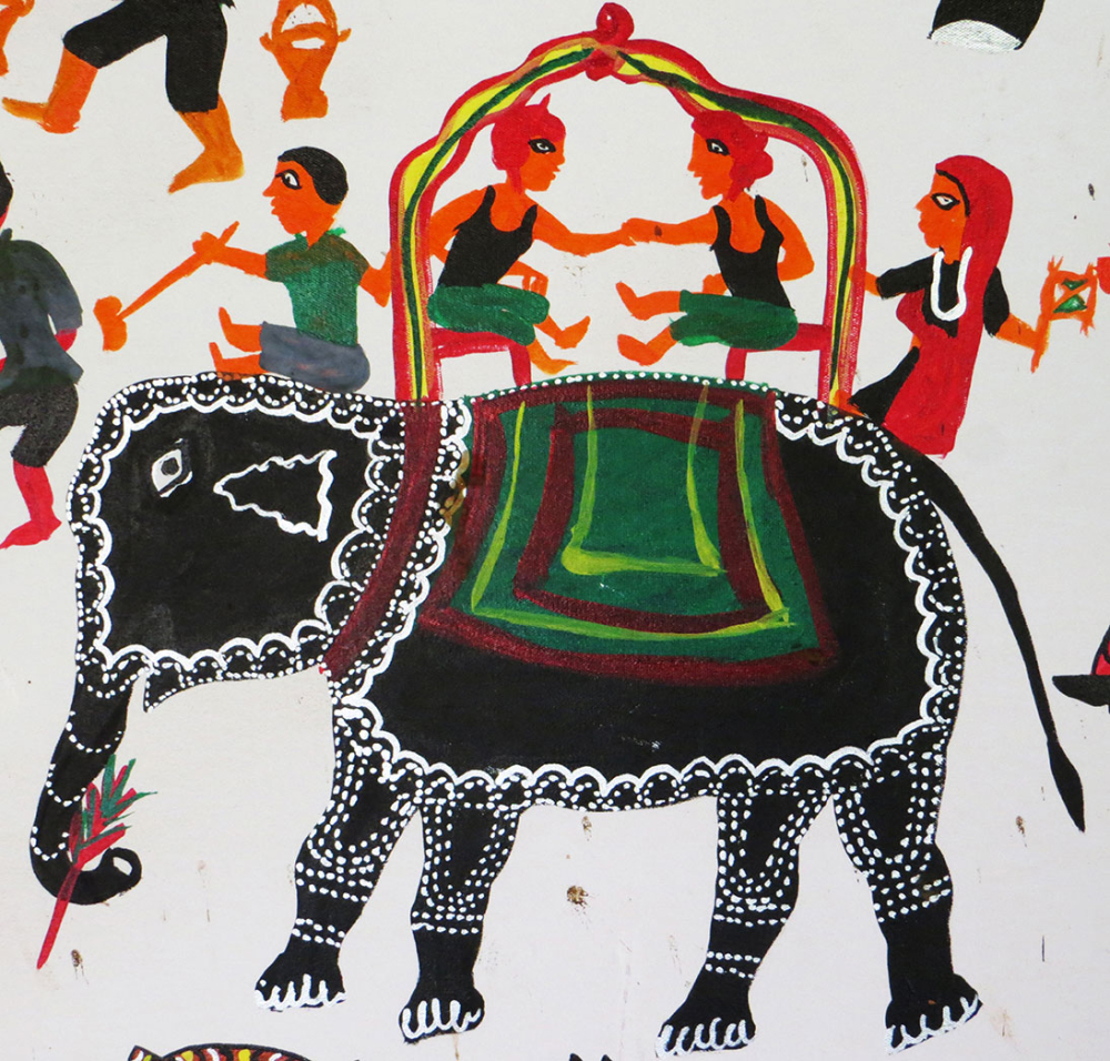 Baba Ganeh is the first motif, drawn customarily on the right side of the painting. He is usually painted in blue and carries a ‘hukka’. Important festivals and occasions commence with the worship of Baba Ganeh among the Rathva. Rathvas also worship Baba Ganeh as Ganpati Dada who always has an elephant’s trunk. In the Pithora painting, Baba Ganeh is characterized as a father figure.