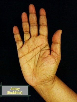 Fig. 5: Abhay (fearlessness): The abhay mudra is made with the open palm of the right hand extending outwards at chest level or slightly higher. It is performed to show fearlessness.