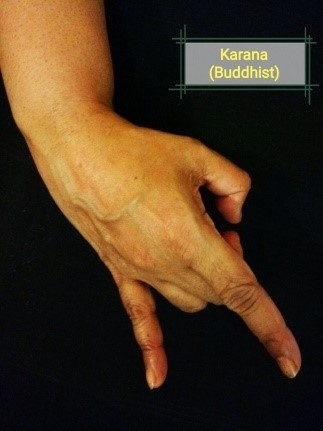 Fig. 6: Karana (powerful energy): This is made by raising the index and little fingers and folding the other fingers. The thumb does not touch the middle and ring fingers. This mudra is performed to expel negative energy and remove obstacles such as sickness or negative thoughts.