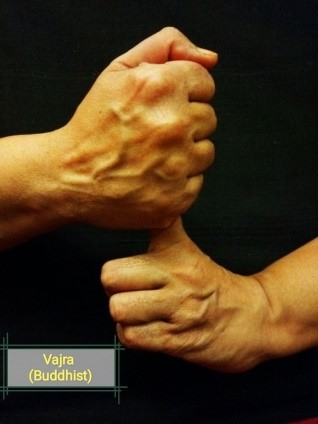 Fig. 7: Vajra mudra: This mudra is formed by enclosing the erect thumb of the left hand in the right fist with the tip of the right forefinger circling around the tip of the left forefinger. This is known as the six elements mudra and symbolises the unity of the five worldly elements—earth, water, fire and air—with spiritual consciousness.
