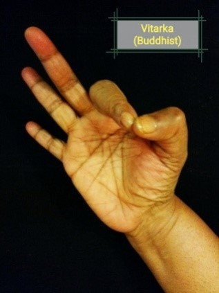 Fig. 8: Vitarka (teaching transmission): This mudra is made by touching the tips of the thumb and the index finger to form a circle, which represents the wheel of law. The middle, ring and little fingers point upwards. This is a mudra of discussion, intellectual argument, and transmission of Buddhist teaching.
