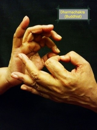 Fig. 9: Dharmachakra (cosmic order): The hands are placed at the heart level, with the thumbs and index fingers forming circles in a manner similar to vitarka mudra. The right palm faces outwards and the left faces the heart. This mudra expresses the continuous energy of the cosmic order and is symbolised by a wheel or chakra.