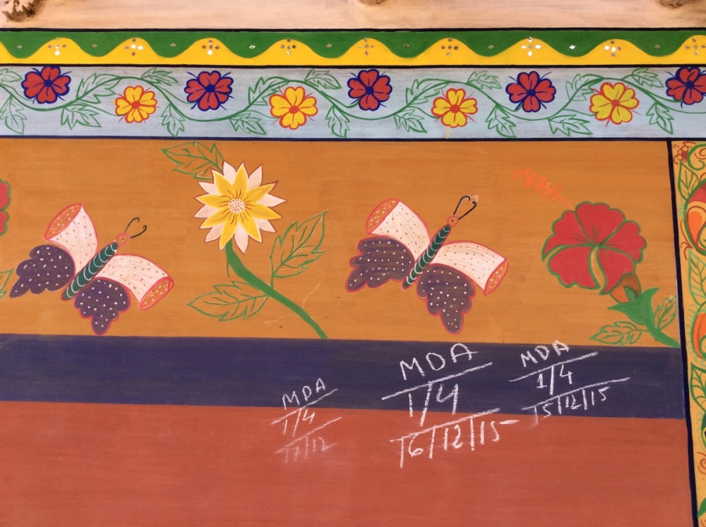 It is important to flag up that not all Singhbhum murals lack detail. The recent addition of paintbrushes to the repertoire of the women artists has led to the emergence of very finely detailed designs in some villages. Women draw elaborate floral patterns, insects, butterflies and decorative details within the horizontal bands painted onto the walls. This, however, is not widespread but is only occasionally found in some villages. Its almost ad hoc occurrence may be attributed to the varying exposure of the women artists, which in turn is directly linked to women’s livelihood and networks of mobility. As mentioned earlier, when women work on construction sites as wage labourers, they encounter the use of paintbrushes and artificial colour more frequently than their agriculturist counterparts. These women then have the opportunity to incorporate the use of brushes into the painting of their murals.