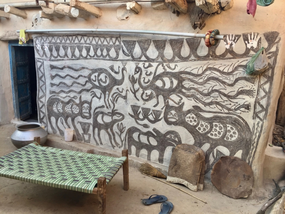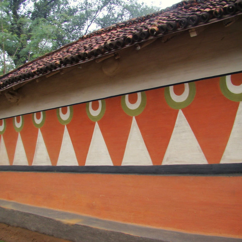 Painting is the more common technique used in mural production. However, due to the variation in tools, the mural designs in different villages and by different communities are quite varied as well. The most basic painting device is a piece of cloth which is dipped in colour and then applied to the wall resulting in large swathes of colour. This technique of painting is common in the Singhbhum region and the basic design scheme comprises broad horizontal bands starting at the base of the wall and extending to the top. It is likely that the strong horizontality of the mural aesthetic is linked to the technique of painting itself.