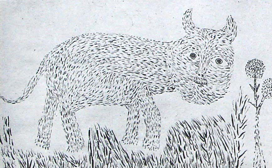 Of these three Muria tribal painters, Shankar and Pishadu gave up painting after some time. Belgur is not a regular painter but is still active and produces the occasional painting when invited for a programme. He was unable to develop sufficiently to sustain himself as a painter.
