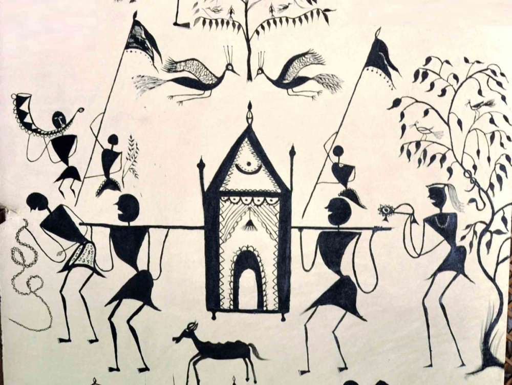 The wall murals he created in 2012 at the Crafts Museum, New Delhi, are a masterpiece and well appreciated by visitors. Painted in black on a yellow ochre background, they depict the tribal life of Bastar—village scenes with figures of men and women, birds, animals, trees and huts, alongside activities like hunting, worship at a shrine, a Dussehra procession, devotees carrying different types of mobile shrines (Doli, Anga, Laat, Kanta Khurchi), dancing groups, drummers, hunting traps etc.