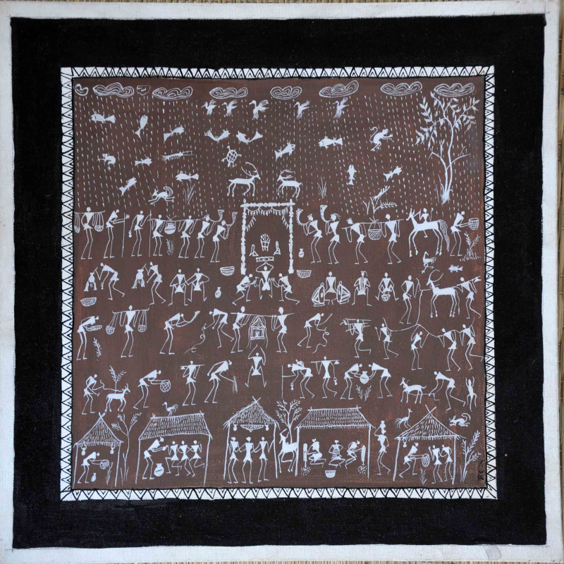From around 2010, however, a distinct type of Muria painting began to appear in the urban art market. These paintings are not the traditional or ritual paintings of Muria tribals, but are created by young Muria tribal artists, who paint aspects of their life and culture with a sensibility and aesthetic that is deeply rooted in their traditions. A young painter, Meheru Muria, began painting on paper and canvas, developing a distinct painting style, with various tribal references. His work has come to be recognized in urban art markets as Muria tribal painting of Bastar. At present, a small group of Muria youth is following this painting style and developing it further.