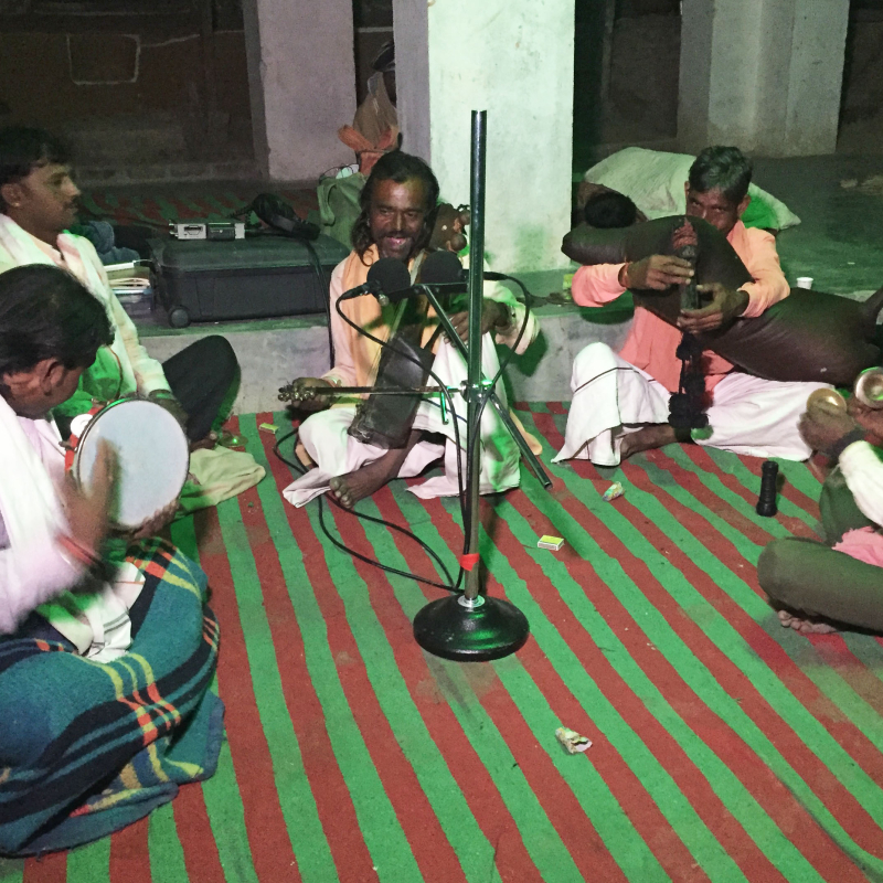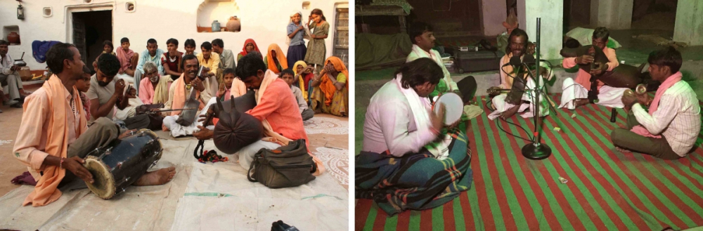 Right: Picture of the recent audio recording of Bharthari-ki-Katha at Amliwala Bhaironjee shrine, village Banda, October 2017. Photo credit: Madan Meena