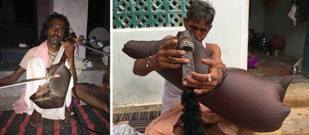 Fig. 2 (Left to right): Antar Jogi playing sarangi (string instrument) and Ramswroop Jogi playing mashak (wind instrument). Photo credit: Madan Meena