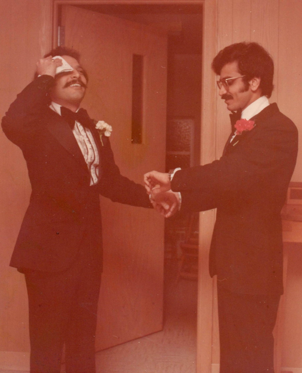 The mail-order boys all dressed up in suits. Andy and Tulsi pose for a ‘my last minute of freedom’ photo just before the wedding ceremony of Andy with Carol.