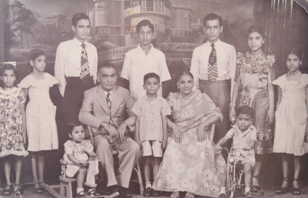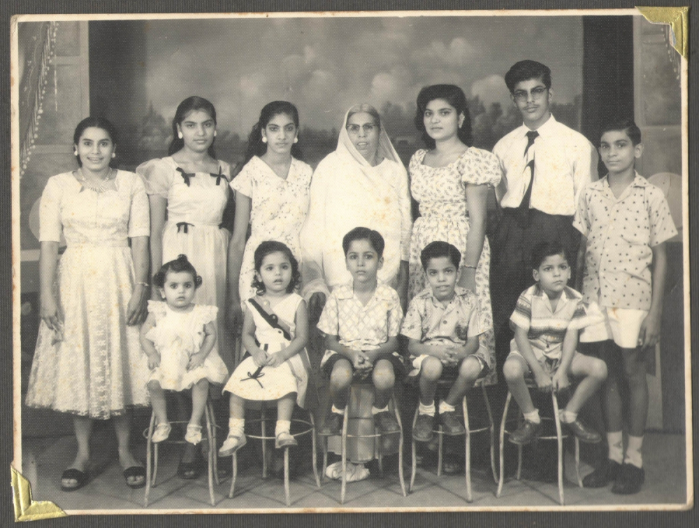 A family photo taken in a Tanjung Pinang studio. My eldest sister, Mohini, was already married and Ishu not yet born. Sheila, Chandra, Babe, KG, Boolchand (my father), Hassomal, Tulsi, Muli (my mother), Jiwat, Ramesh, Lacha, Pushpa. All the children’s clothes seen in this photo were sewn by their sister Mohini.