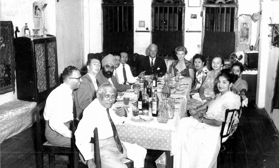 With his chair turned to face the camera is Mangomal, a Sindhi gentleman who worked with Ghanshamdas. On either side of him are Ghanshamdas and his wife Mohini. A British and a Chinese couple are seen in this photo; the husbands worked with the British firm Guthrie Company. The Sikh gentleman wearing a turban is Meher Singh, the Indian Consul in Medan. Next to him sits Lachmandas, and Kala is across the table, next to Mohini.