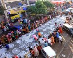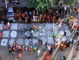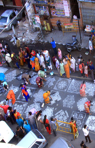 The gallery includes documentation of the kolam contest held from January 6-7, 2018, at North Mada Street, Mylapore in Chennai, as part of the annual Mylapore Festival. The kolam competition is an integral part of this annual festive event wherein hundreds of women participate and compete in kolam-making, filling the streets with a variety of kolam designs. This year the theme for the event was pulli kolam.