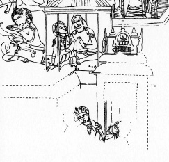 The emphasis on details which are mostly of little significance for the contents and often of inferior quality not only impedes an adequate artistic assessment, it can sometimes lead to grotesque misinterpretations. Thus, for example, in one frequently published painting fragment a woman is depicted, behind whose left arm a man’s arm can be discerned. The usual interpretation of this picture as a loving caress appears to be impossible for the mere reason that this arm reaches so far down, that the whole weight of the man’s body is on the woman’s shoulders. A study of the picture in its context reveals unambiguously that this arm does not belong to a lover, but to a shipwrecked man, close to death from exhaustion, who is being dragged by the woman from the coast of the island through the city gate to her house. In the houses inside the city the shipwrecked merchants really do sit together in cosy companionship with the charming island women, who are in reality man-eating witches (Figures 1-3: “The lover’s arm” (No. 58 (2))[1].