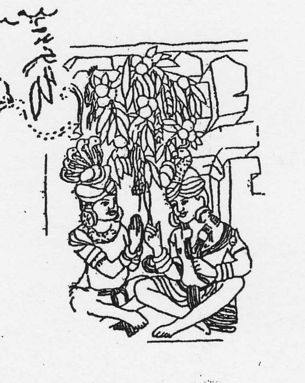 (2) The grove of the birth, bordering a building on the left and a ceremonial gate (toraṇa) on the right, is marked, in the right half of the painting, by a forest complete with an aśoka tree, a pāṭali, a kadalī and another pāṭalī tree. In the centre of the painting stands the mother of the Bodhisatva who, during child-birth, is clinging with both hands to the branches of a blooming śāla tree and slightly leaning her head to the left, where a woman stands with a whisk of peacock feathers; a drum above her indicates the celestial music accompanying the miraculous event. In the left half of the painting five deities are standing in a lower, three more in an upper tier; the former, in the lower tier, are pointing their index fingers at the event, the latter, in the upper tier, are hurling their shawls up in the air; the one in the middle, moreover, touches his lip with his index finger, to lend expression to his amazement at the miraculous event.