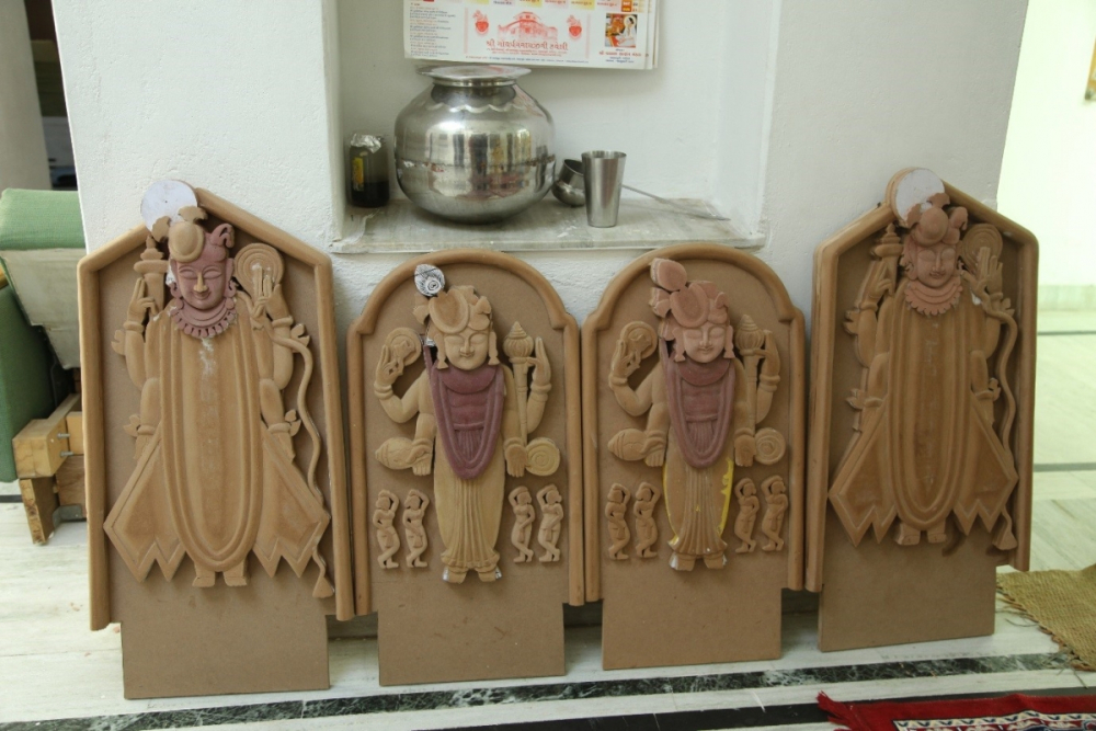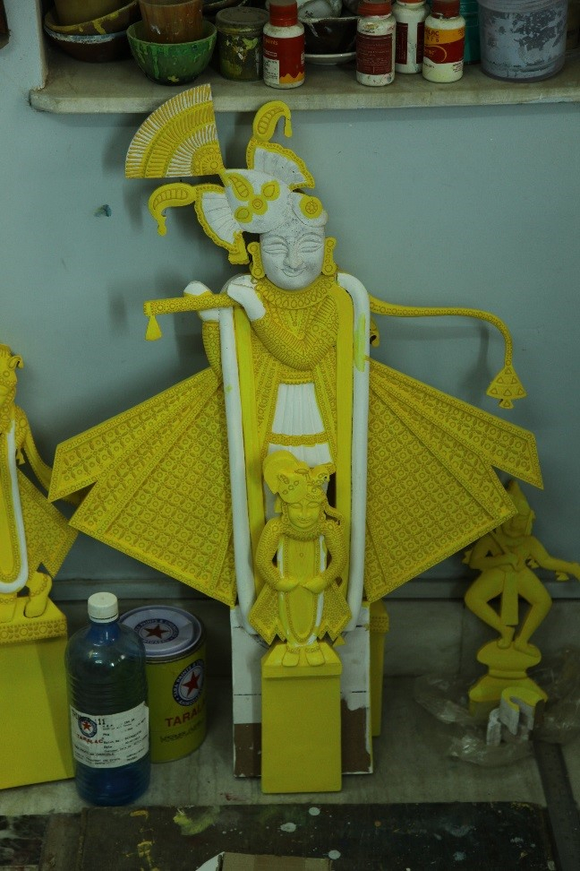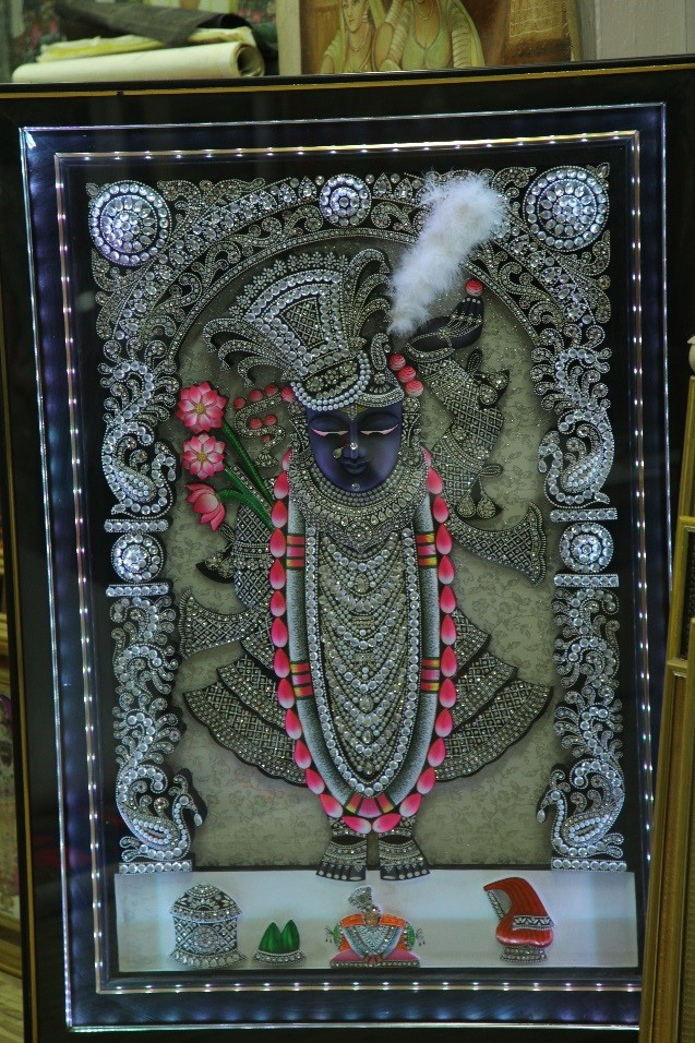 Right side: Icon images, wooden cut-outs for souvenir making in the studio, Harishchandra Swarnakar, Kankroli. Left side: Diamond studded and embellished wooden cut-outs of Srinathji icon with painted background