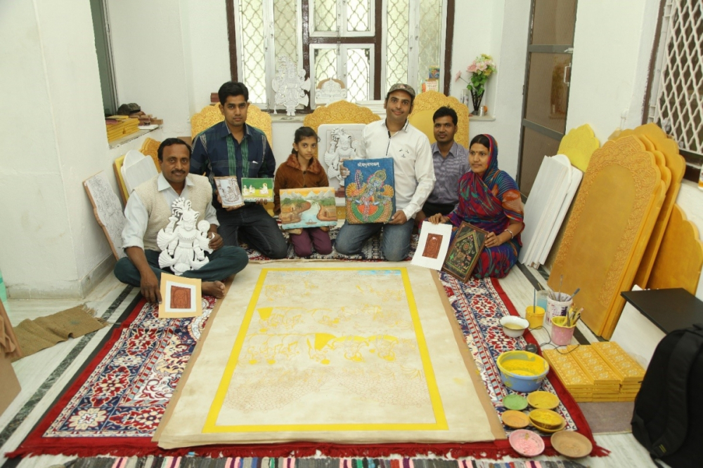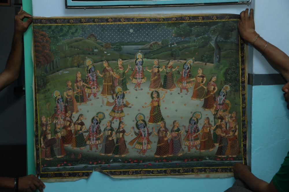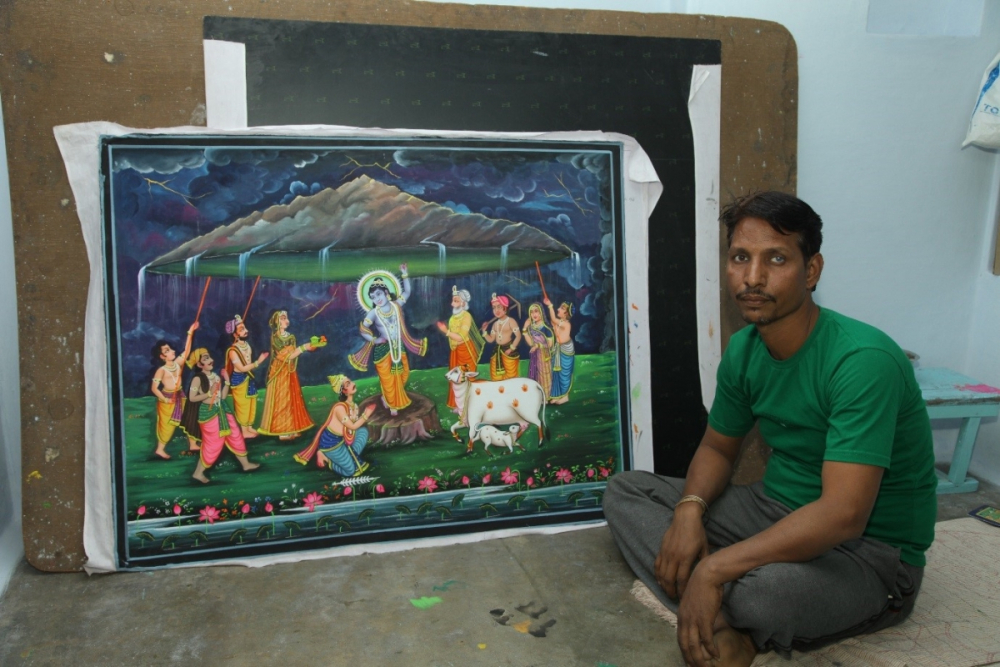 Vishnu Harnarayan Sharma (41 years old): Vishnu is also the son and disciple of the late Harnarayanji. He paints pichhwais, murals and Krishna Leela paintings. Both Harikant and Vishnu conduct workshops for young enthusiasts in their studio. They also follow their family tradition of temple painting seva.