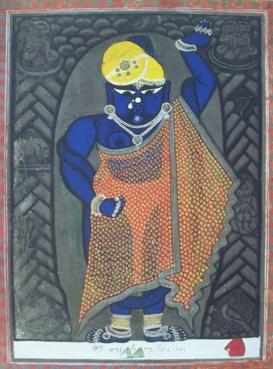 Nathadwara paintings display a high degree of skill in draughtsmanship, portraiture and in composition. In manoratha paintings, the Shrinathji idol is always shown with goswamis and often patronised by a wealthy devotee who takes care of the expenses of a particular darshana and seva. The devotee also commissions a painting to commemorate this event, which usually depicts the devotee and family members on both sides of Shrinathji. Krishna Leela paintings depict Krishna’s childhood and scenes from his early life in Gokul such as playing in Yashoda’s lap, stealing butter, Ras Leela with Radha and other gopis, lifting Govardhana mountain etc.