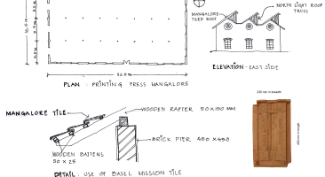 This module documents and traces the native methods of building in South India, especially its roofing systems, before and after the Industrial Revolution. Circumstantial reasons and resources shape this trajectory and provide for unique practices in the region. From mud roofs to thatch roofs, to potters' tiles, to mechanically produced Mangalore tiles, which adorn many heritage buildings, each has its own unique historical significance in India. The module specially focuses on fired clay components, especially Mangalore tiles, first made by the Basel Mission in 1865 and are still continuing to be made, as an example to demonstrate the significance of process. Potters’ tiles, clay columns, drainage pipes, ceiling and flooring are some of the building components which were made by craftsmen in the early 19th century in the Mangalore region. With the introduction of steam power and mechanization in 1865 by Basel Mission in Mangalore, they transform in their form, production and use.