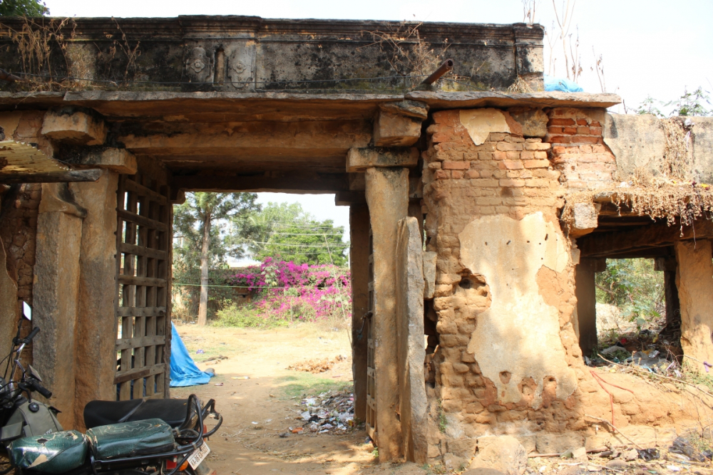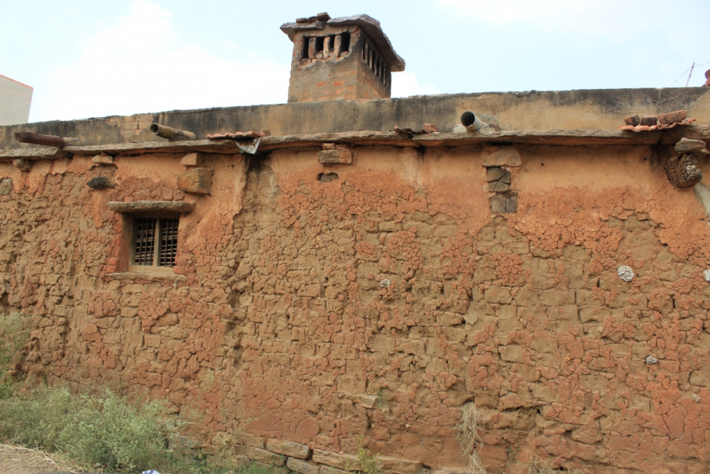 The house placed inside this magnificent fort is about 120 years old—it has granite walls and Madras terraced roofs. It has an interior central room with raised walls and habitable rooms all around. Ventilated walls light the space. The entrance of the house has a jaggalli (raised porch) with a mud and wood reaper roof. The interior of the house has a Madras terrace roof, which is made with layers of wooden beams, bricks kept on their edges finished with a mixture of broken brick, pieces of stone called ‘jelly’, and lime plaster.