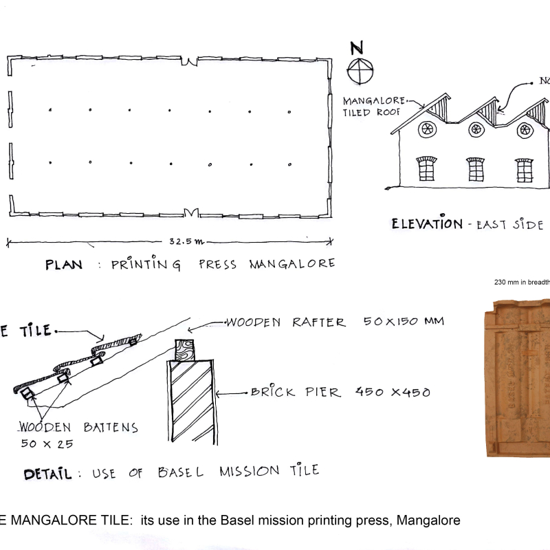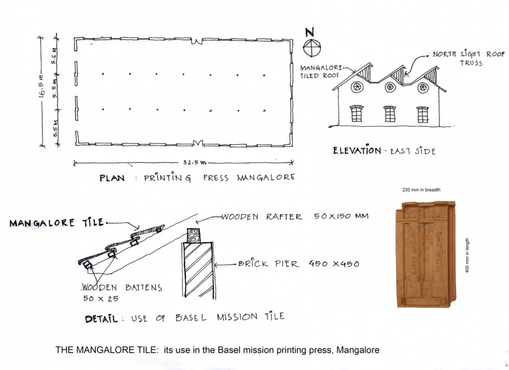 The Mangalore printing press building, built by the Basel Mission around 1900 (originally a weaving unit), uses Mangalore tiles and demonstrates the regular, symmetrical, and standardised form of architecture. The building has bricks made by the Basel Mission factories in the walls, clay ceiling and flooring tiles, and the Mangalore tiles on wooden trusses. The building is rectangular, with wooden rafters at regular intervals; the Mangalore tiles sit on the rafters. The high walls support a north-facing light truss. The strong symmetry of the building is a consequence of the machine-made components. The tectonics in the building are a result of the material and its form.