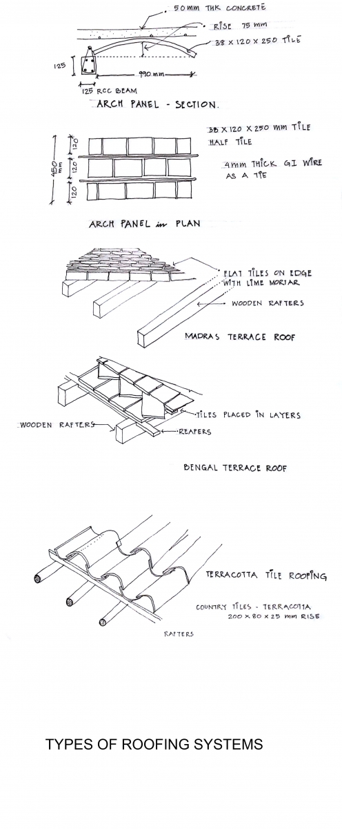 Madras Terrace: flat terrace similar to Madras terrace but has rafters with large and bricks on edge laid in lime mortar.