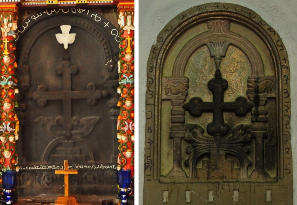 Fig. 1. Pahlavi-inscribed St. Thomas crosses: St. Mary’s Knanite Jacobite Valiyapally, Kottayam (left) and St. George Church, Kadamattam (right) (Photo: Antony Joseph Nangelimalil)