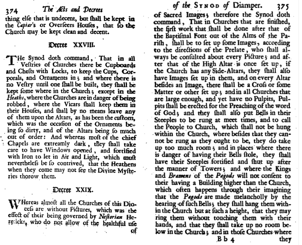 Whereas almost all the churches of this Diocese are without pictures, which was the effect of their being Nestorian Hereticks, who do not allow of the healthful use of Sacred Images; therefore the Synod doth command, That in Churches that are finished, the first work that shall be done after that of the Baptismal Font out of the Alms of the Parish, shall be to set up some images, according to the direction of the Prelate, who shall always be consulted about every picture; and after that of High Altar is once set up, if the Church has any Side-Altars, they shall also have images set up in them, and on every Altar besides an Image, there shall be a Cross or some matter or other set up; and in all Churches that are large enough, and yet have no Pulpits, Pulpits shall be erected for the preaching of the word of God; … (Geddes, 1694, pp. 374-375).