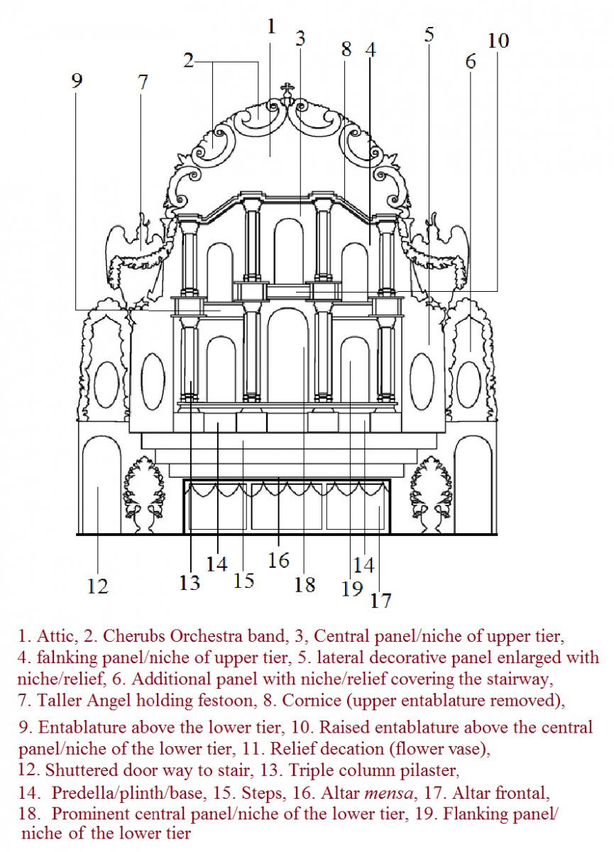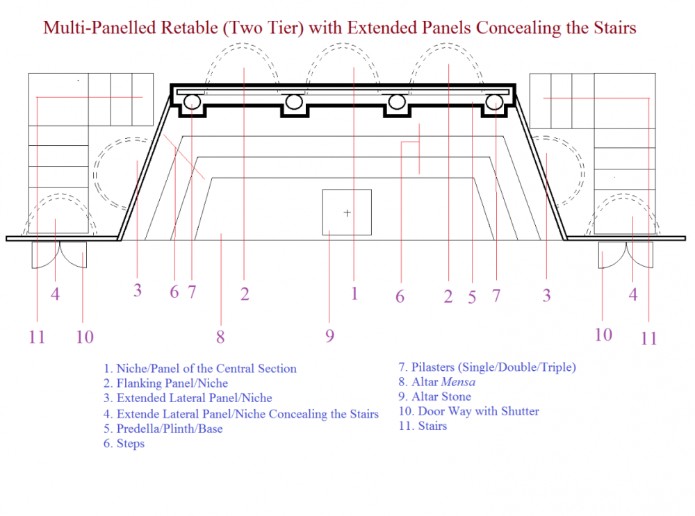 Fig. 7. Section of multi-panelled retable (two tiers) with extend panels/niches concealing stairs (Illustration: Antony Joseph Nangelimalil)