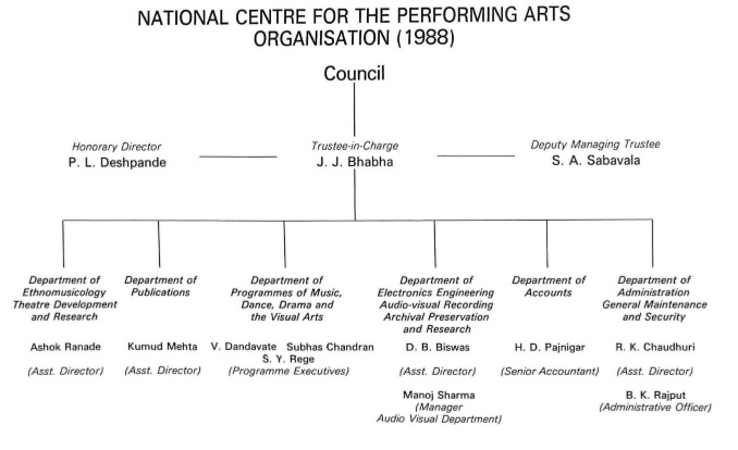 The organizational chart for NCPA, Mumbai in 1988.